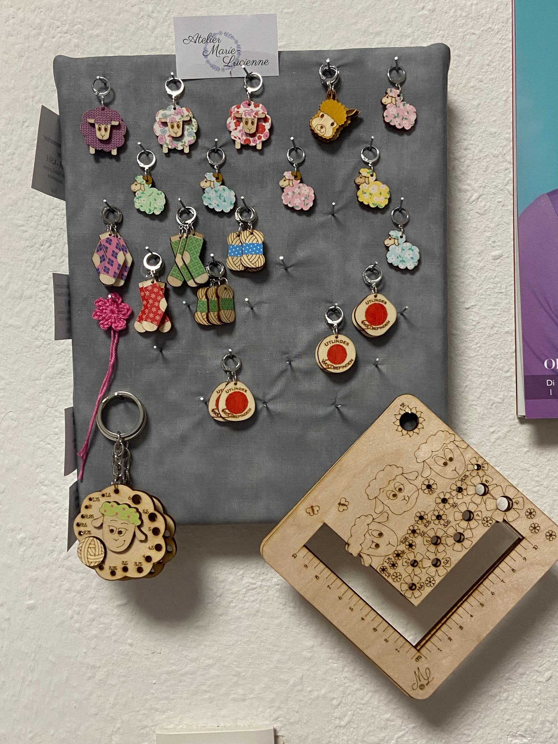 Beim Atelier Marie-Lucienne habe ich für euch wunderschöne Maschenmarkierer, zum Teil auch mit meinem Logo, Nadelmaße und Zählrahmen eingekauft. Ich hoffe sie gefallen euch so gut wie mir.