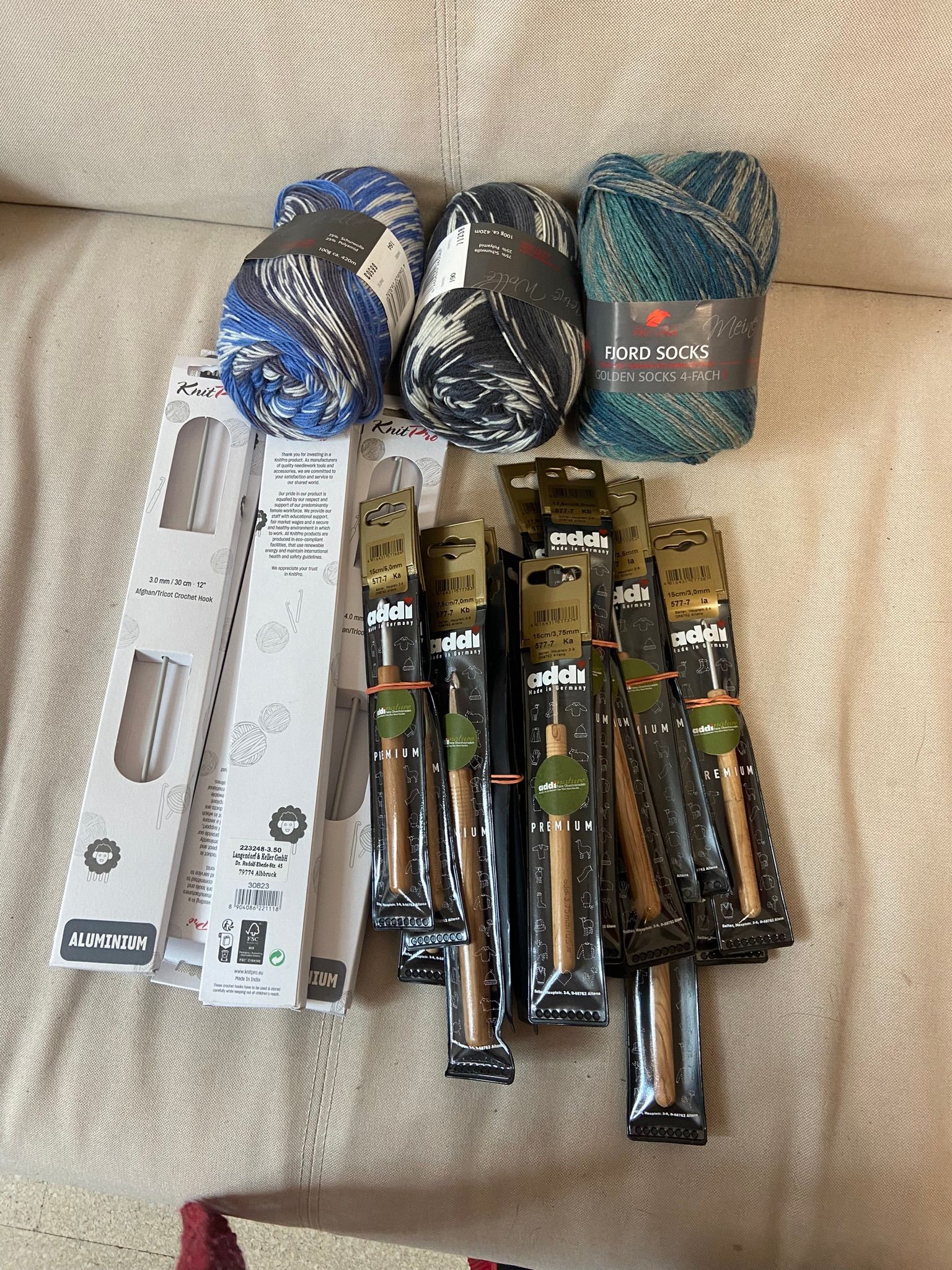 Letzte Woche eingetroffen: Häkelnadeln mit Olivenholzgriff und selbstmusternde Sockenwolle