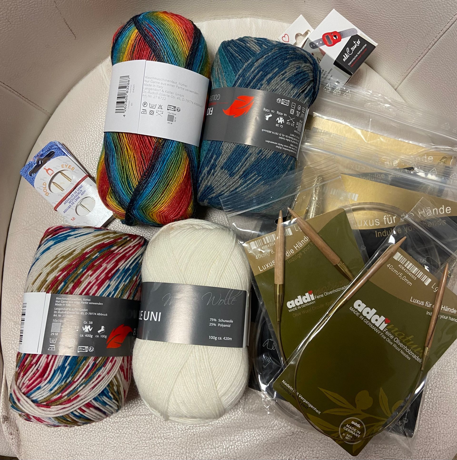 Bei der Sockenwolle handelt es sich um einen Nachkauf von weißer 4-fädiger Wolle und Fjord Socks in Türkis. Neu ist die helle Fjord Socks Multicolor und die regenbogenfarbige Golden Socks Nessel. Von Addi habe ich dickere 40 cm Rundstricknadeln aus Olivenholz eingekauft. Die ganz dicken 25 mm Nadeln wurden bestellt und schon abgeholt.