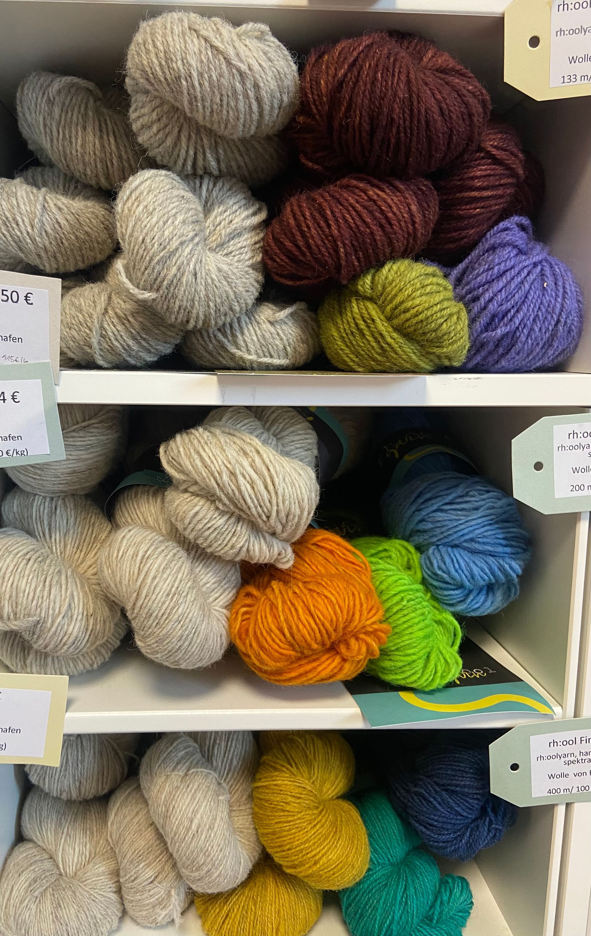 Ganz kurz vor Weihnachten erhielt ich noch die neue Wolle von rh:oolyarn. Ich habe nun eine neue Qualität der Düsseldorfer Wolle: Baby Bloom mit einer Lauflänge von 200 m auf 100g und drei Qualitäten der Wolle von Kölner Rheinschafen. Die Kölner Wolle gibt es aktuelle in natur und schwarz. Ich habe fino mit 400 m auf 100 g, trino mit 266 m auf 100 g und bloom mit 200 m auf 100 g. Alle Qualitäten sind gut geeignet für Oberteile, Schals und Mützen.