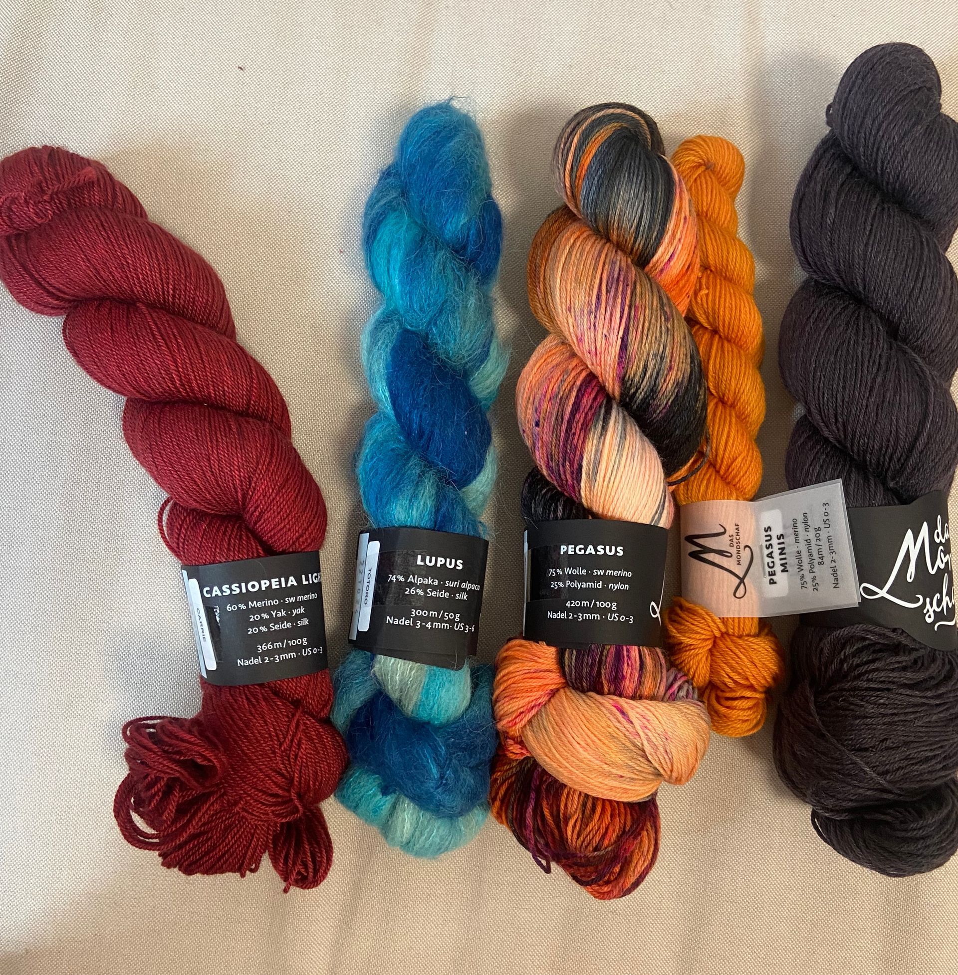 Beim Mondschaf habe ich die Monatsfärbung Shocktober als Sockenwolle Pegasus bestellt. Dazu kamen die Farbe Black Hole und die Minis Lichfield. Mitbestellt habe ich in der Qualität Lupus die Farbe Totoro und Cassiopeia light in der Farbe Carrie.