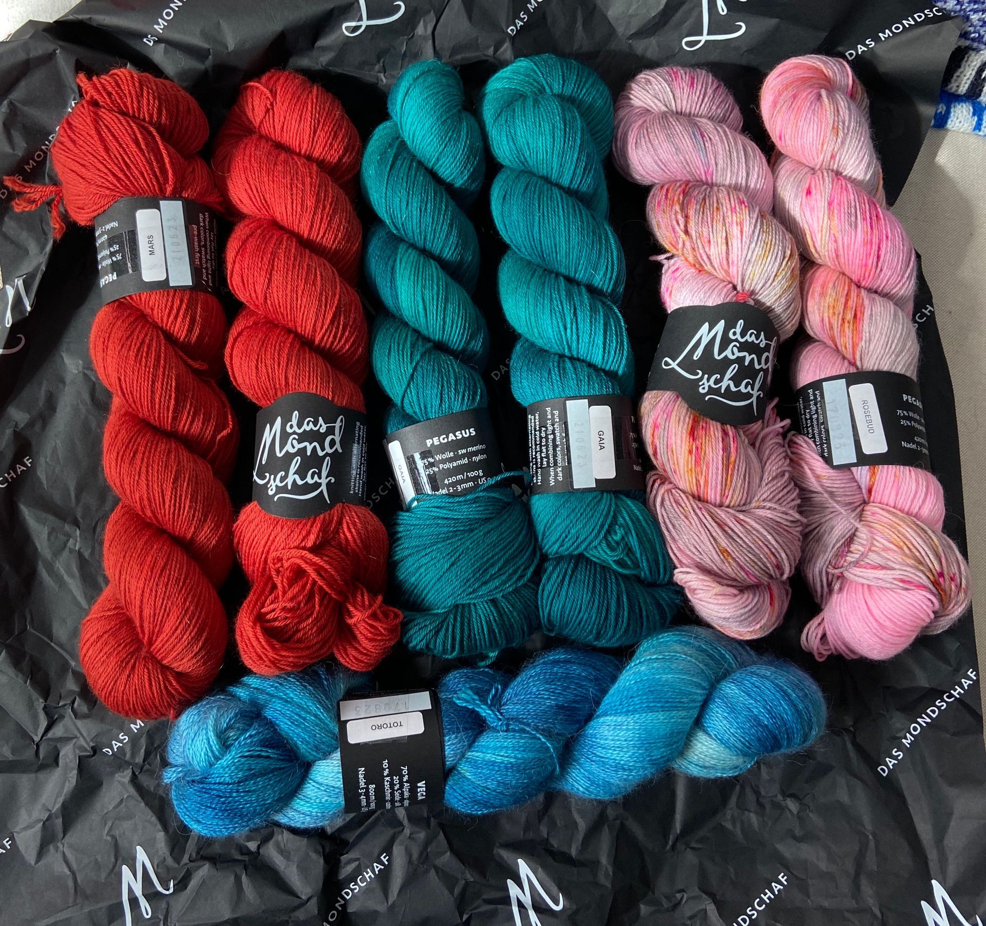 Heute kam hier Nachschub der Sockenwolle Pegasus von Das Mondschaf an. Es sind nun die Farben Mars, Gaia und Rosebud neu vorhanden. Zusätzlich traf von der neuen Qualität Vega, die aus Alpaka mit Seide und Kaschmir besteht und eine Lauflänge von 800m auf 100 g hat, die Farbe Totoro ein.