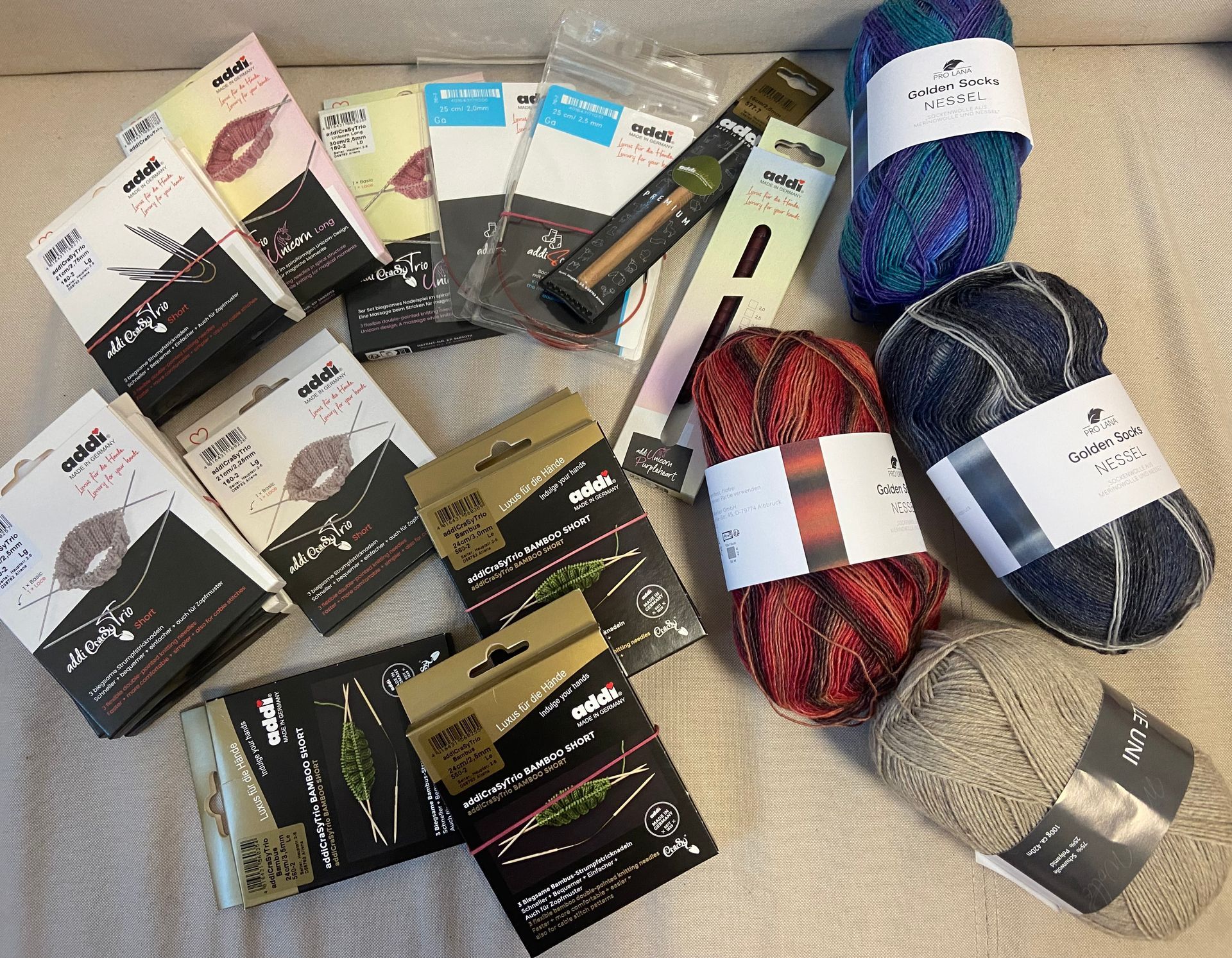 ich habe mein CraSy Trio-Sortiment von addi ergänzt, Sockenwunder nachbestellt. Sockenwolle statt mit Kunststoff mit Nessel (Ramie) verstärkt eingekauft und die klassische Sockenwolle in einer Farbe nachgekauft. Die Häkelnadeln hatte ich schon früher geordert.