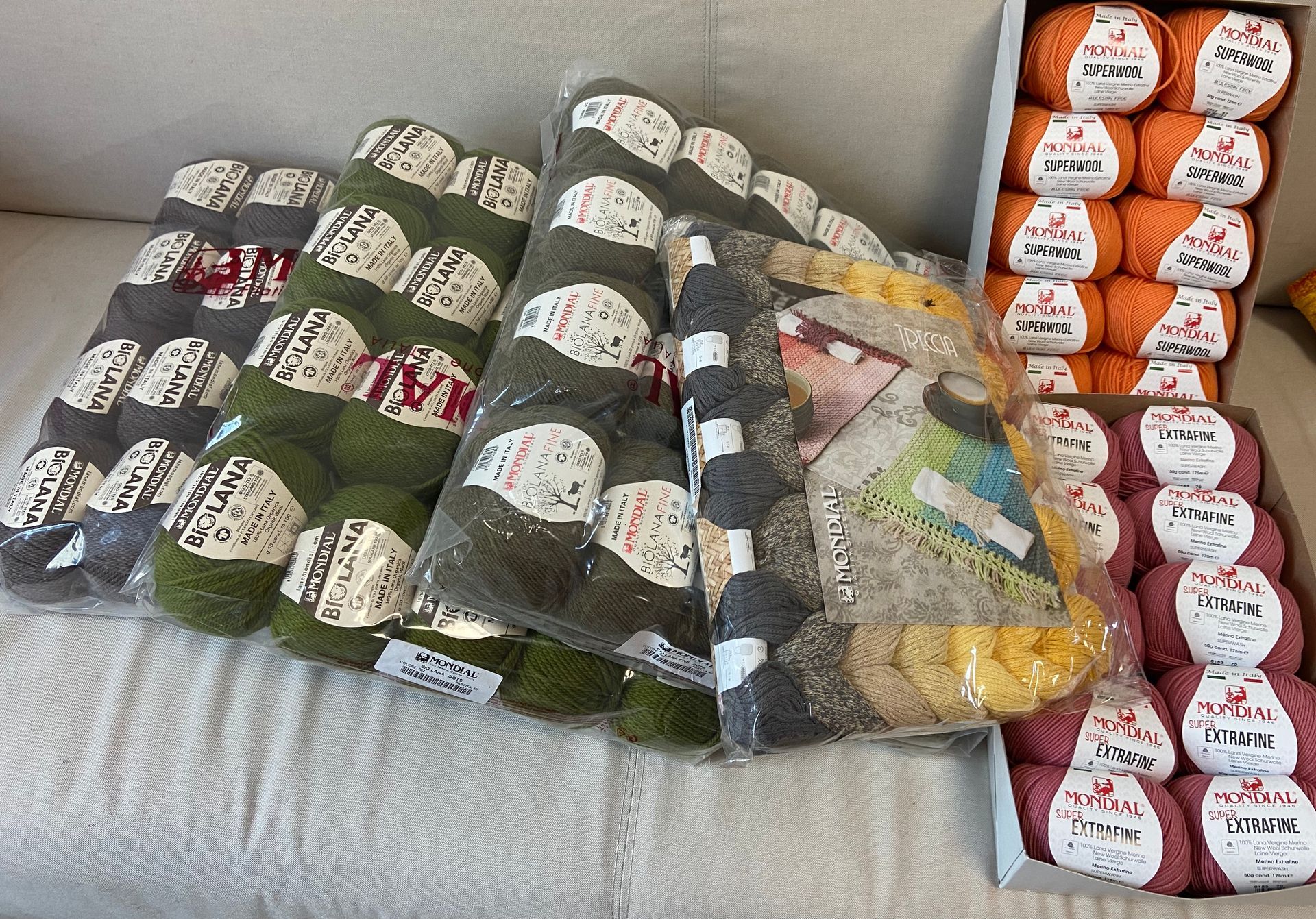Heute traf wieder neue Wolle von Mondial ein. Ich habe zwei Farben von Biolana (grün und braun} nachgekauft und je eine weitere Farbe von Biolana fine (muschelgrün) , Extrafine (Erdbeereis), Superwool (Orange Carolina) und Treccia (gelb bis grau) hinzugenommen.