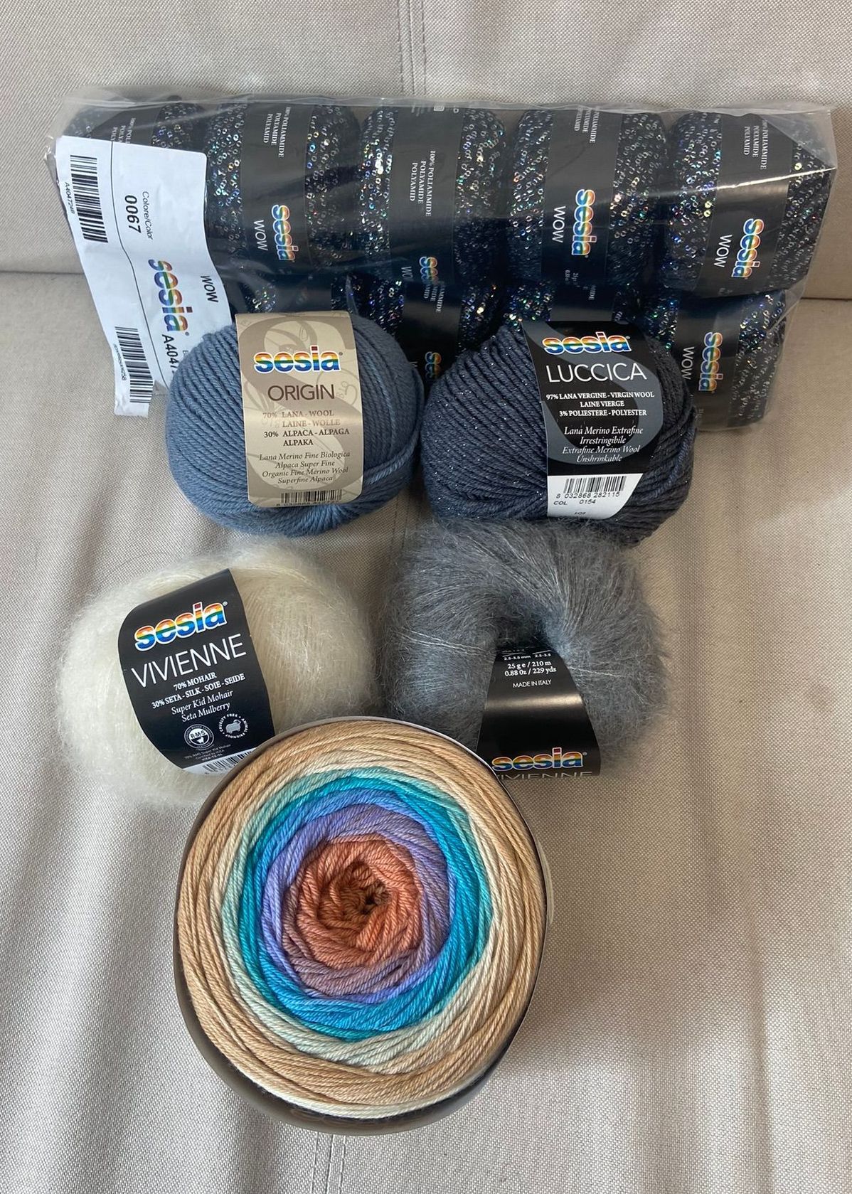 Für eine Kundin habe ich Wow, das Pailettengarn mit vielen Minipailetten von Sesia gekauft. Sie wurde schon abgeholt, aber ich bin gerne bereit sie auf Anfrage zu bestellen. Mitgekommen ist das hellblaue Origin (Merino mit Alpaka), graue Luccica (glitzernde Merino), zwei Farben Vivienne (KidMohair-Seide) und eine neue Farbe Talent (Merino mit Farbverlauf).